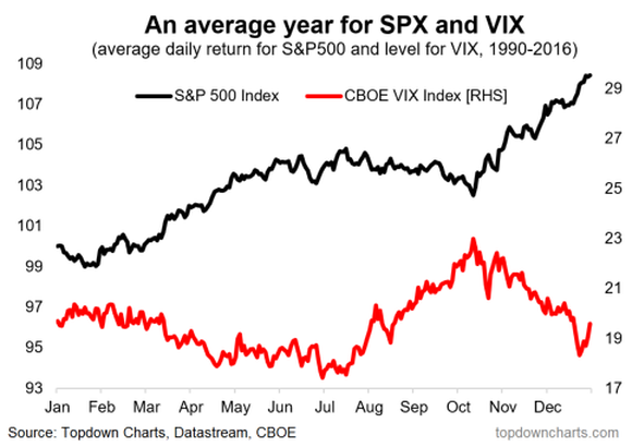 Die Erfahrung zeigt, dass die Kursschwankungen bzw. die Volatilität dann sinkt, wenn die Aktienkurse nachhaltig steigen. Entwickeln sich die Aktienkurse aber seitwärts oder sinken gar tendenziell, dann steigt meist die Volatilität. Das lässt sich gut anhand einer Graphik zeigen, die den Zeitraum von 1990 bis 2016 umfasst und die durchschnittliche monatliche Aktienkursentwicklung der entsprechenden Volatilität gegenüberstellt. Wer also den Volatilitätsindex kauft, verdient dann besonders viel Geld, wenn die Aktienkurse crashartig sinken.